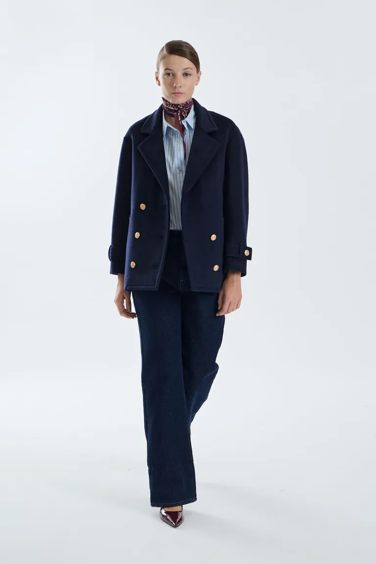 Abrigo con diseño de inspiración naval, con largo hasta la cadera, cruce frontal y doble botonadura metálica. Presenta un estilo estructurado con detalle de pinzas en la espalda, ideal para completar equipos formales o casuales durante los días de frío.