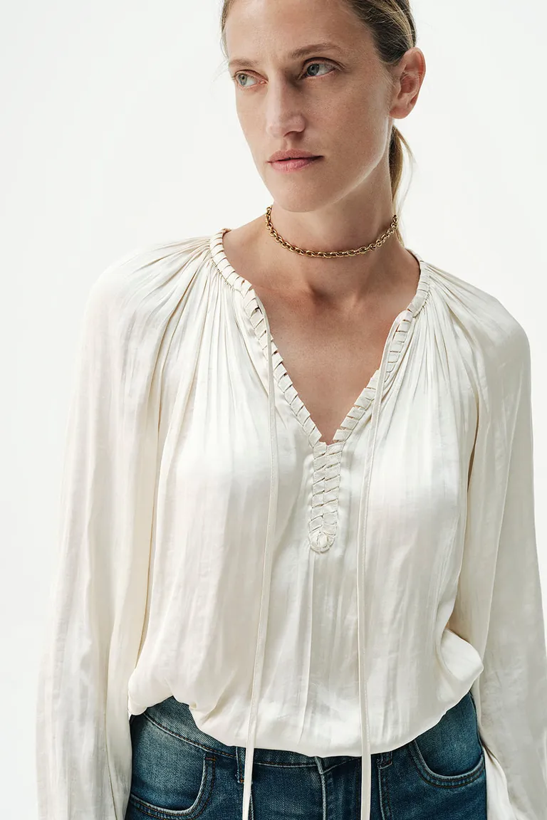 Blusa de calce holgado y ligero con mangas amplias estilo balloon. Presenta un diseño con delicado plisado y un detalle de escote entrelazado artesanal. Es una prenda versátil, ideal para crear estilismos sofisticados y frescos para el uso diario o eventos especiales.