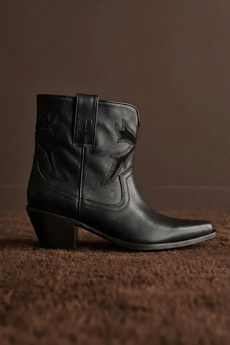 Bota estilo texana con caña media, detalle de bordado decorativo y cierre lateral. Presenta un diseño versátil de estilo clásico con taco cómodo, ideal para combinar en diversos outfits cotidianos o formales. Su terminación de punta acentuada brinda una silueta estilizada y moderna para el día a día.