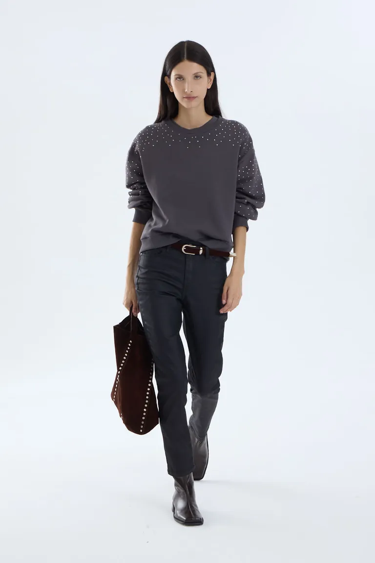 Buzo de calce regular con cuello redondo. Presenta un diseño distintivo con apliques de strass distribuidos en la parte delantera y en las mangas. Posee terminaciones con puños y cintura, ideal para un look casual y versátil en el guardarropa femenino.