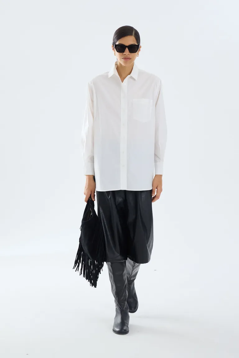 Camisa de calce amplio y relajado, diseñada con cuello clásico y un bolsillo aplicado frontal. Una prenda versátil y atemporal con cierre de botones, ideal para crear diversos estilos en cualquier momento del día, brindando comodidad y un aspecto moderno.
