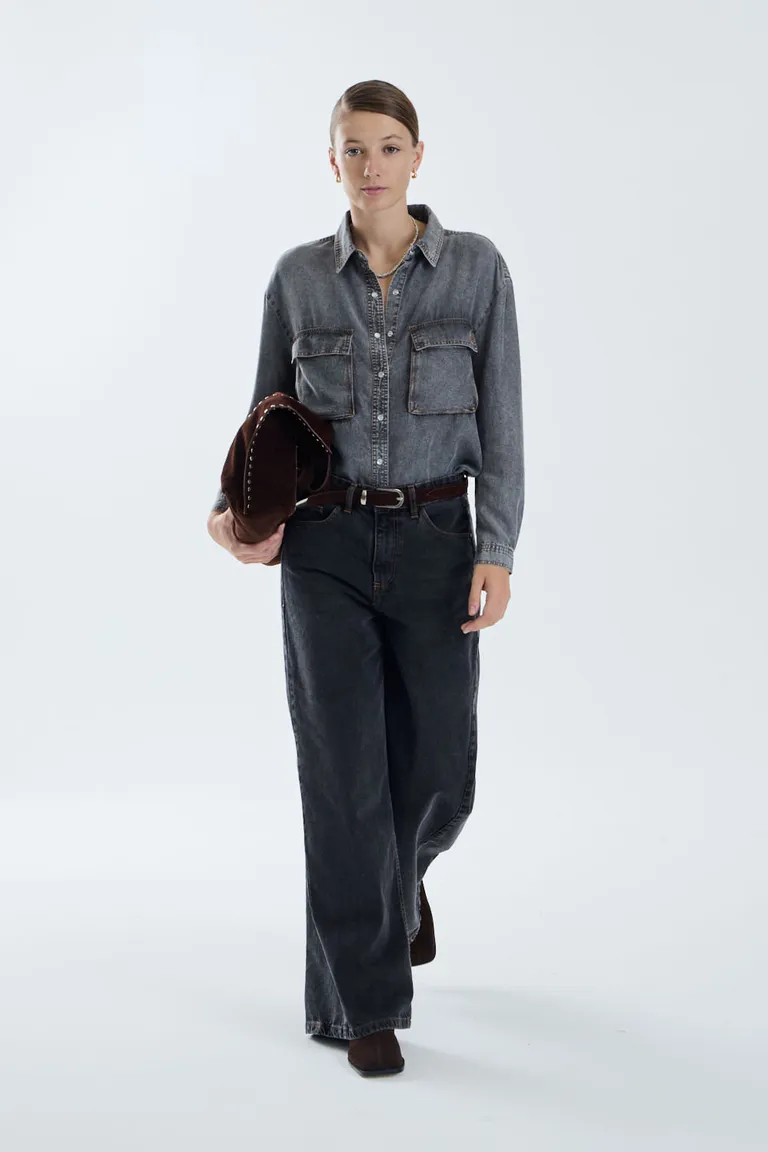 Camisa de calce holgado con cuello clásico y mangas largas. Cuenta con bolsillos frontales con tapa, ideales para un look diario con estilo relajado y versátil.