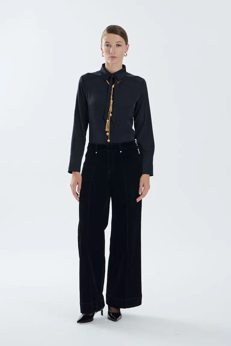 Camisa de corte clásico con calce levemente holgado, manga larga y puños anchos con abotonadura. Presenta un cuello camisero tradicional acompañado por un delicado corbatín desmontable para anudar, aportando un toque distintivo y versátil para elevar cualquier conjunto. Una prenda esencial con acabado satinado diseñada para brindar comodidad y elegancia en diversas ocasiones.