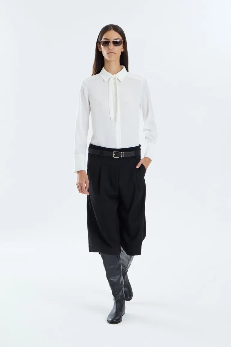 Camisa de corte clásico y ajuste levemente holgado, ideal para completar un conjunto formal o de oficina. Presenta mangas largas con puños anchos y un cuello camisero tradicional. Incluye un detalle de corbatín desmontable para anudar al cuello, aportando un toque refinado y versátil a la prenda. Una pieza esencial de diseño atemporal que ofrece comodidad y estilo en cualquier ocasión.