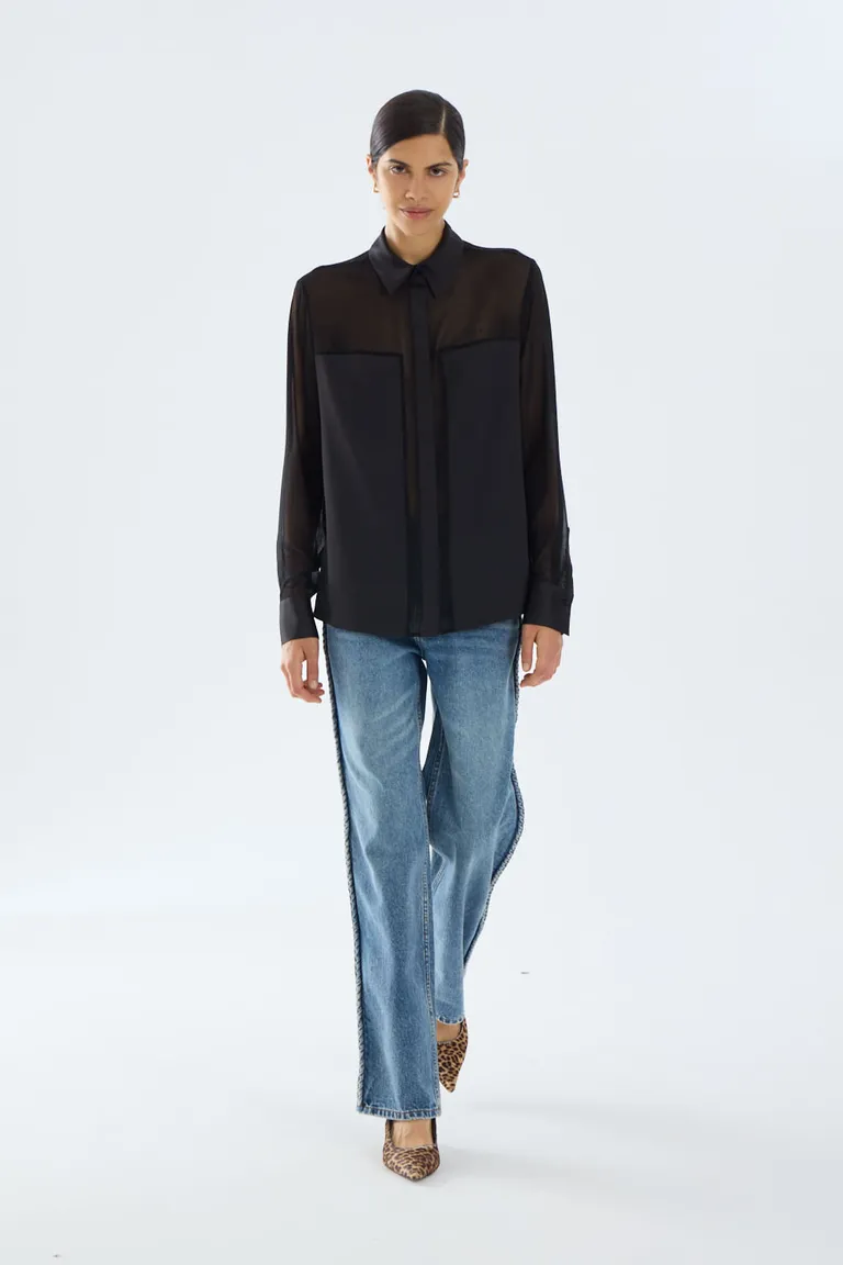 Camisa de calce recto con cuello clásico, cierre central y mangas largas. Presenta un diseño versátil con combinación de texturas y sectores con transparencias que aportan distinción. Ideal para completar outfits formales o casuales con estilo moderno y sofisticado. Un básico imprescindible para el guardarropa femenino, diseñado para brindar comodidad y un ajuste favorecedor.