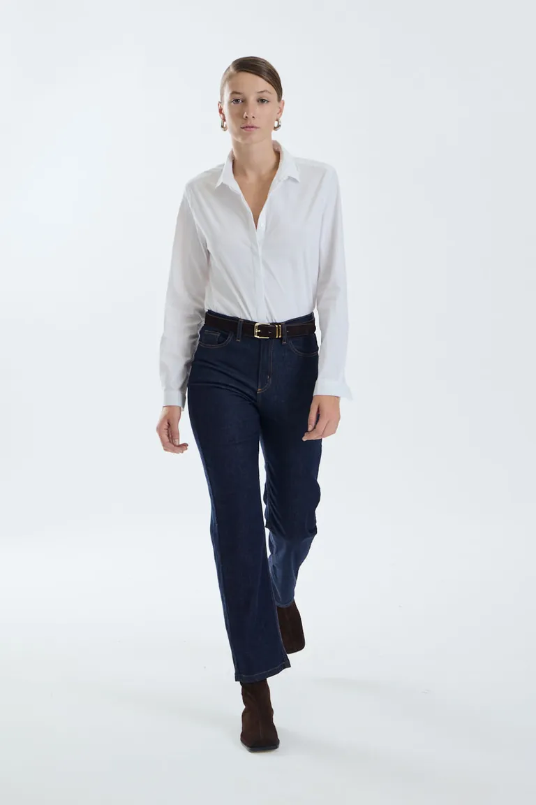 Camisa de mujer con cuello clásico y manga larga. Presenta un calce recto y diseño de estilo formal, ideal para completar equipos de oficina o outfits casuales y versátiles. Una prenda básica con cartera central de botones que se adapta a diferentes momentos del día.
