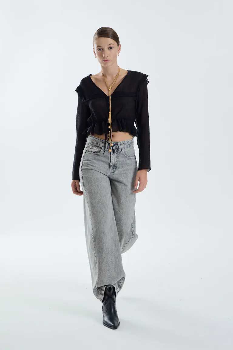 Camisa de manga larga con escote en V y cierre frontal con botones. Presenta un ajuste definido en la cintura y delicados detalles de volados que aportan un estilo romántico. Su diseño semi transparente es ideal para lograr un look versátil y femenino en diversas ocasiones.