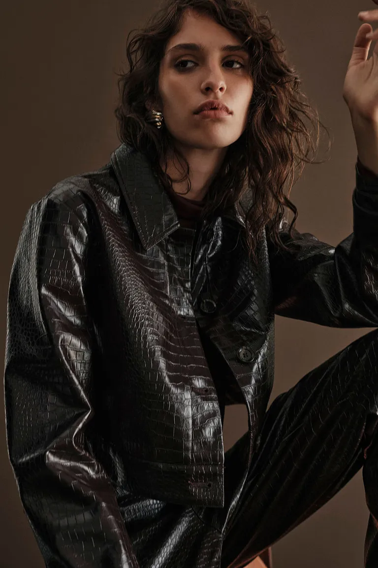 Campera corta con diseño de textura reptil y cuello camisero. Presenta cierre frontal con botones y un corte que llega a la cintura, ideal para combinar con prendas de tiro alto. Esta chaqueta aporta un toque distintivo y actual a cualquier conjunto urbano, ofreciendo una estructura definida y versátil para el día a día.