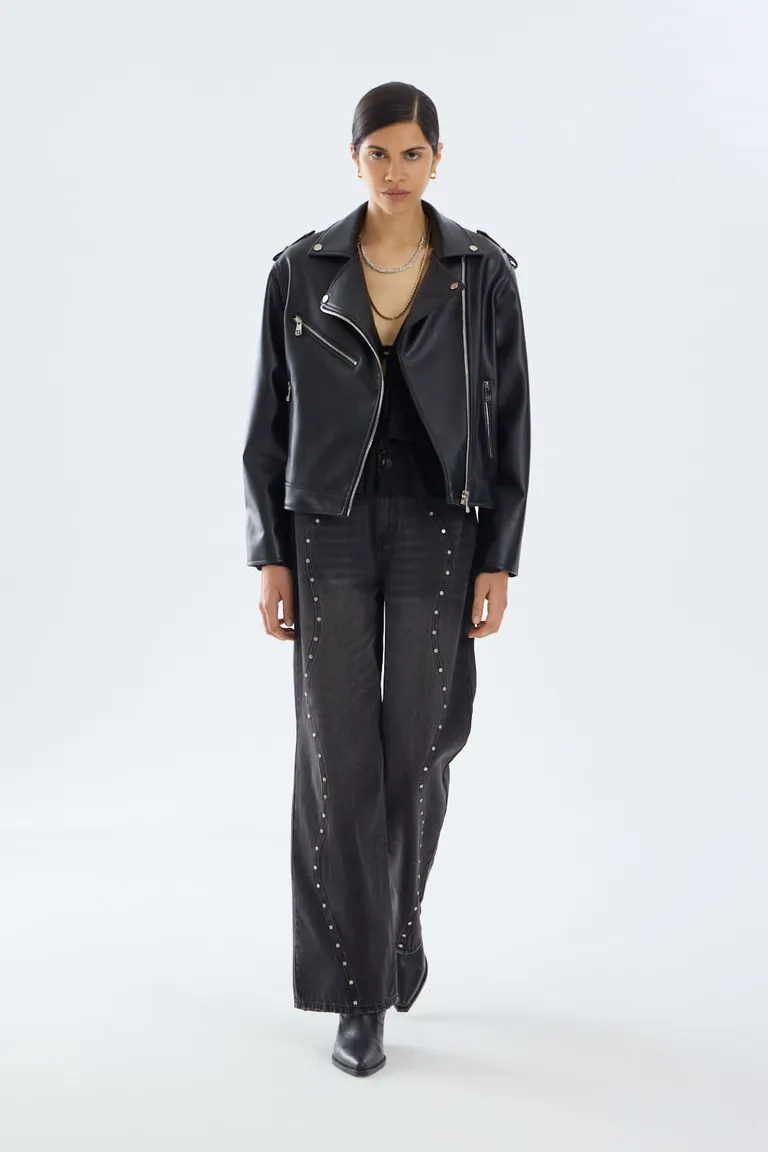Campera estilo moto biker con diseño clásico de calce a la cadera. Incorpora cierres metálicos en el frente y bolsillos, brindando un acabado funcional y versátil. Esta prenda cuenta con interior forrado, siendo una opción ideal para completar outfits urbanos y modernos durante todo el año.