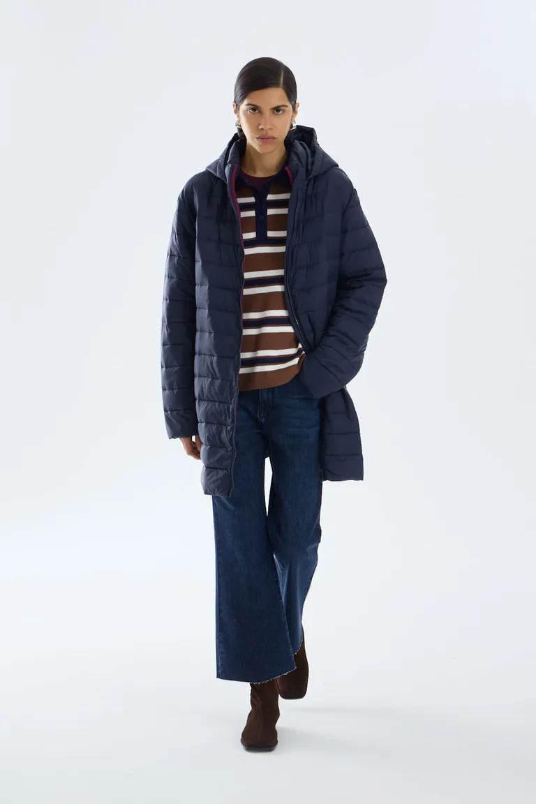 Campera de diseño largo hasta el muslo con cuello alto y capucha desmontable. Presenta un diseño matelaseado con costuras oblicuas, incluyendo bolsillos externos e internos para mayor funcionalidad. Esta prenda destaca por su ligereza y versatilidad, ideal para completar equipos urbanos durante las temporadas de temperaturas bajas. Incluye un accesorio para su guardado y traslado.