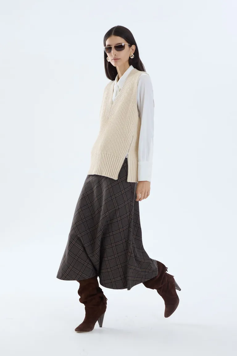 Chaleco de tejido con escote en V y diseño relaxed. Presenta aberturas laterales y terminaciones con detalles de estilo intervenido. Una prenda versátil ideal para superponer en looks de capas, aportando textura y un toque moderno a cualquier conjunto diario.