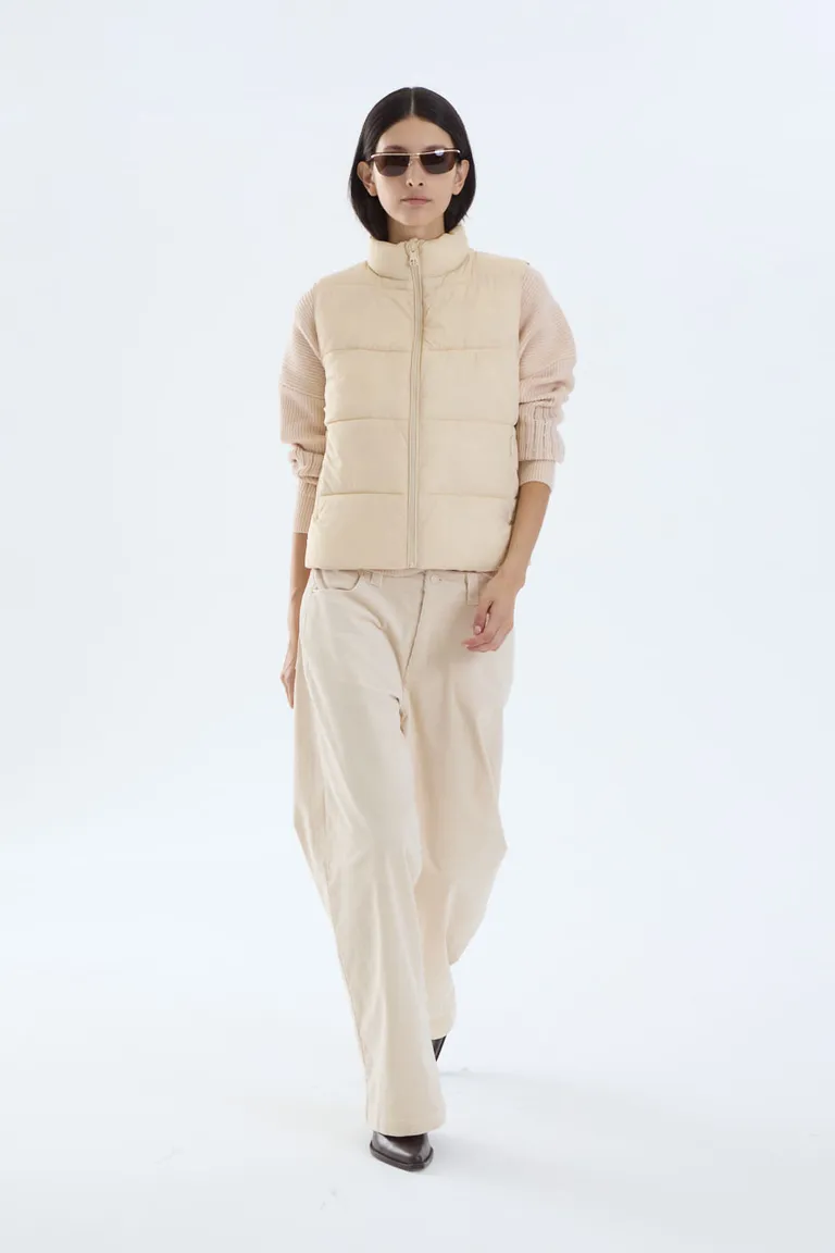 Chaleco tipo puffer de calce relajado y largo hasta la segunda cadera. Presenta diseño con cuello alto, cierre frontal y bolsillos funcionales en los laterales. Una prenda versátil ideal para combinar en looks urbanos y funcionales durante la temporada de frío.