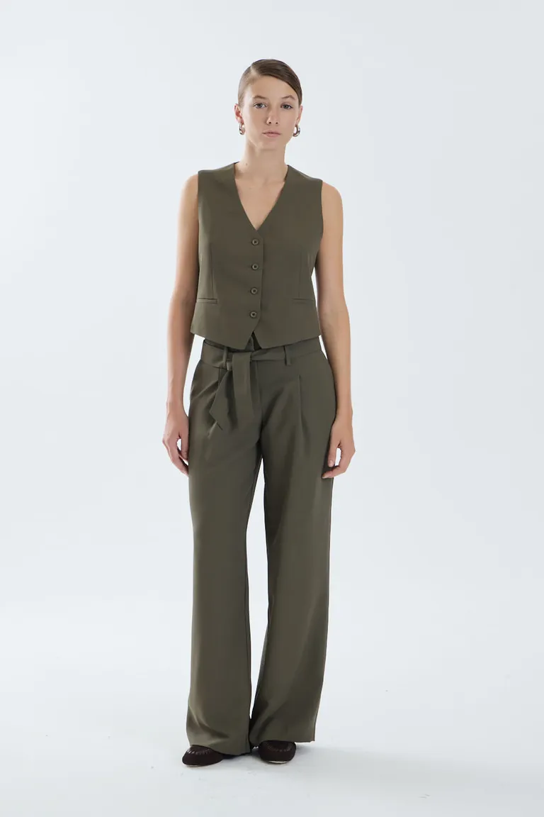 Chaleco sastrero de diseño clásico con cierre frontal de botones. Una pieza versátil y elegante que permite múltiples combinaciones para lograr estilismos formales o informales en cualquier ocasión. Ideal para complementar conjuntos sastreros con pantalón haciendo juego, aportando estructura y sofisticación al guardarropa femenino.