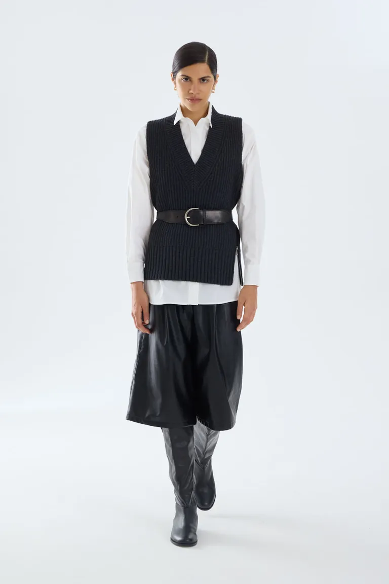 Chaleco tejido con escote en V y diseño relaxed. Este diseño presenta una textura marcada y detalles laterales que aportan un estilo diferenciado, ideal para combinar sobre camisas o prendas base. Una pieza versátil para sumar capas a tus conjuntos diarios, brindando un toque de estilo urbano y moderno.