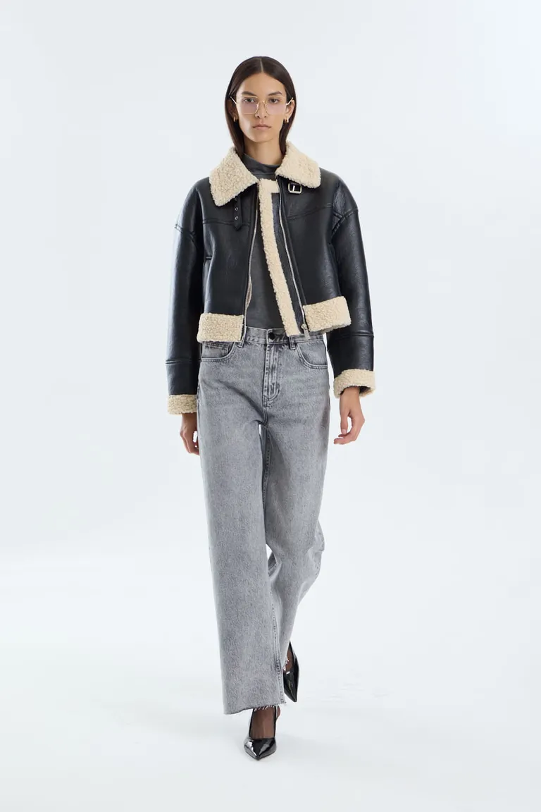 Chaqueta de diseño corto tipo gamulán con detalles de corderito visible en cuello, puños y ruedo. Posee cierre frontal y trabas metálicas decorativas en la parte superior. Una prenda versátil y funcional para completar tus outfits de invierno, ideal para combinar con jeans o pantalones sastreros. Corte a la cadera que aporta estructura y estilo a cualquier conjunto urbano.