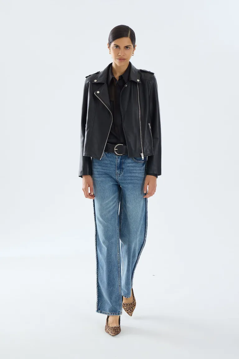 Chaqueta de diseño tipo motociclista con cierre frontal cruzado. Presenta un corte estructurado y detalles clásicos que aportan estilo a cualquier conjunto urbano. Una prenda versátil para el uso diario en diversas temporadas.