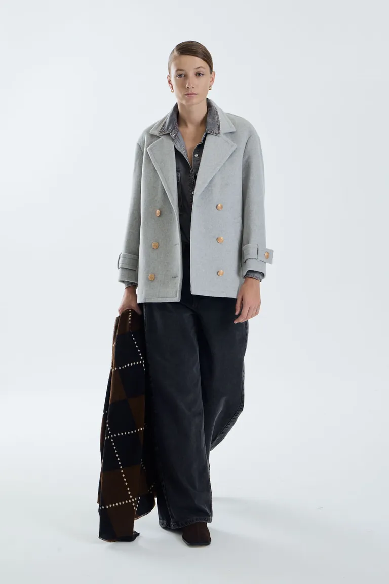 Chaqueta de corte naval con cruce frontal y doble botonadura metálica. Presenta un diseño de largo modular a la cadera, ideal para complementar outfits urbanos con un toque clásico y sofisticado. Incluye detalle de pinzas en la espalda para un mejor calce.