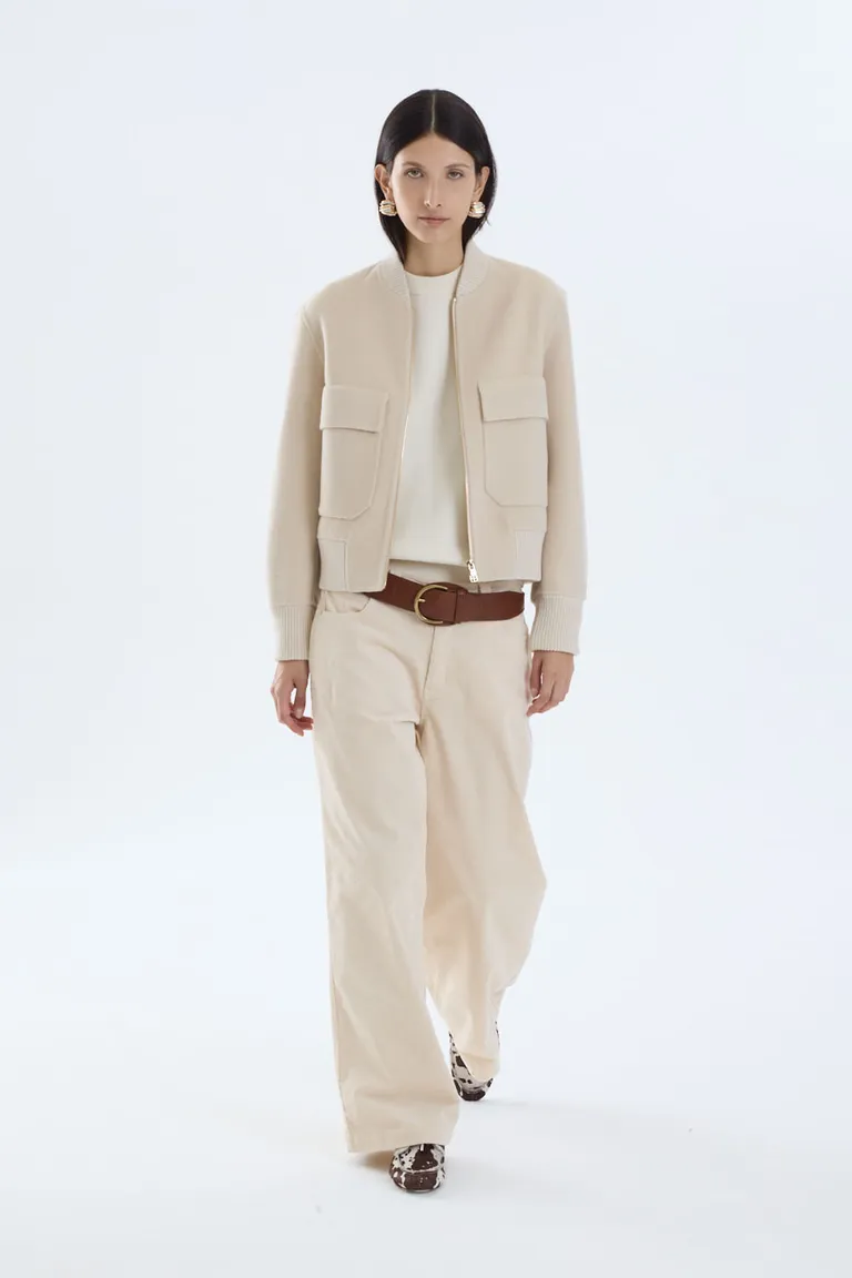 Abrigo corto de diseño tipo bomber con cierre frontal. Presenta bolsillos aplicados en el frente y un corte minimalista. Ideal para sumar una prenda de abrigo versátil a tus conjuntos diarios, brindando un estilo urbano y sofisticado. De calce cómodo, esta chaqueta es una pieza clave para combinar con diferentes outfits en la temporada.