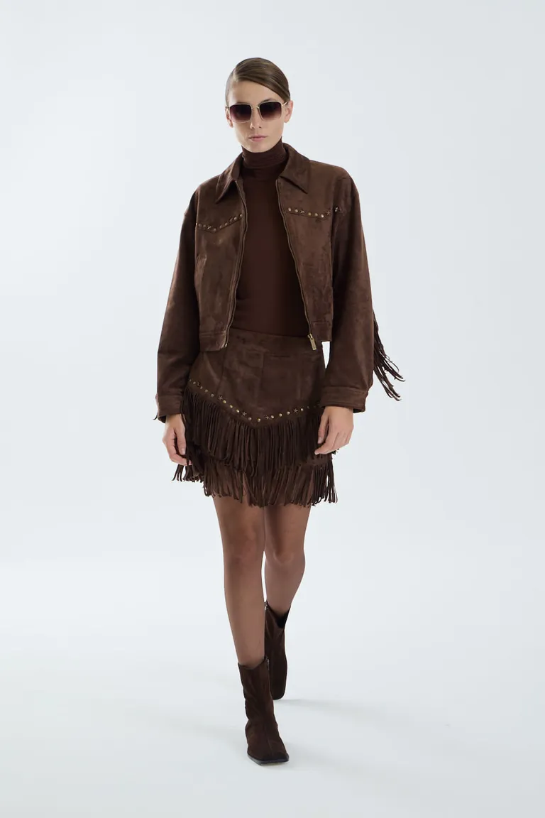 Falda mini de suede con flecos y detalles de tachas, una apuesta boho ideal para el día a día de Portsaid
