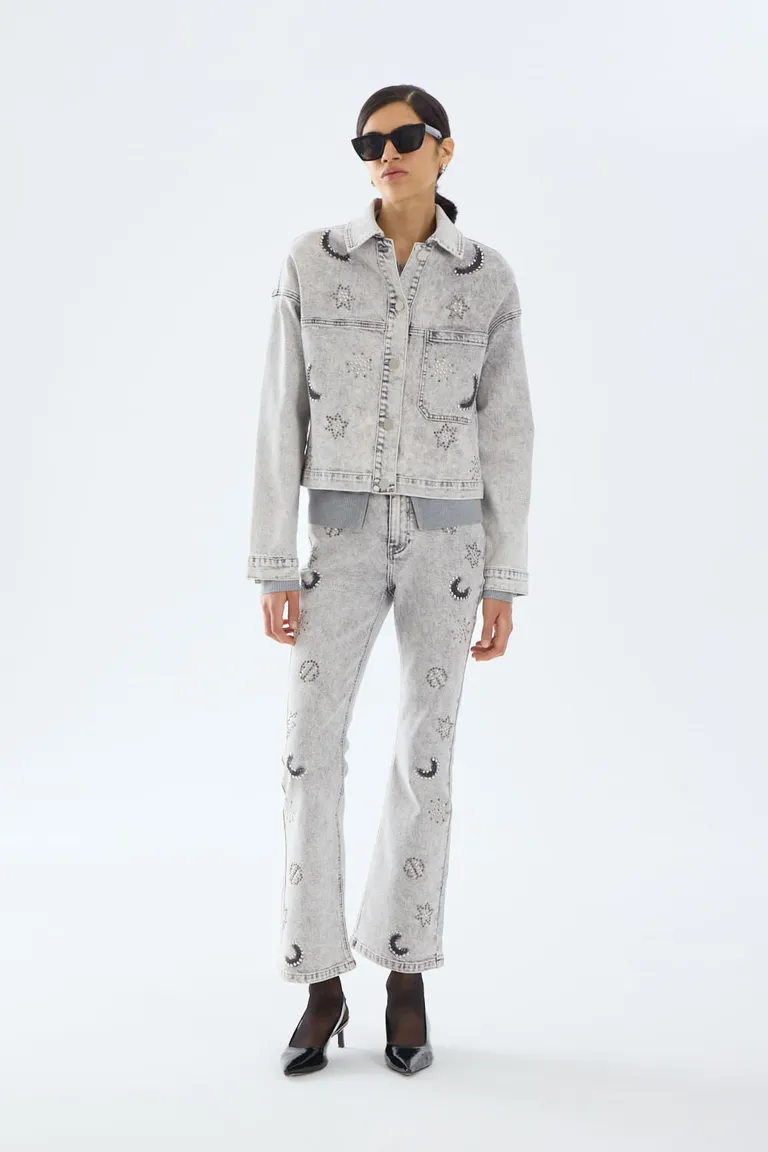 Pantalón de corte flare ajustado hasta la rodilla con detalles de tachas aplicadas que forman figuras decorativas. Una prenda con personalidad y estilo folk, diseñada para ofrecer un calce favorecedor y auténtico. Ideal para elevar cualquier conjunto diario con un toque texturizado.
