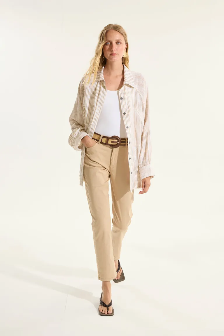 Pantalón de corte recto confeccionado en un tejido liviano y cómodo de algodón con stretch. Diseño versátil y elegante para usar en diferentes ocasiones.