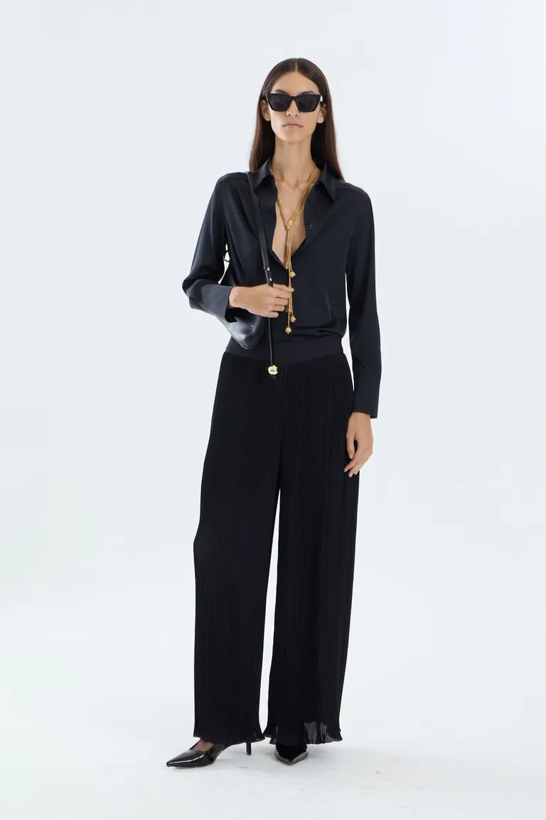 Pantalón de corte ancho con detalle de plisado en toda la prenda. Diseño de tiro medio que aporta comodidad y movimiento. Una pieza versátil y elegante para completar diversos conjuntos de uso formal o casual.