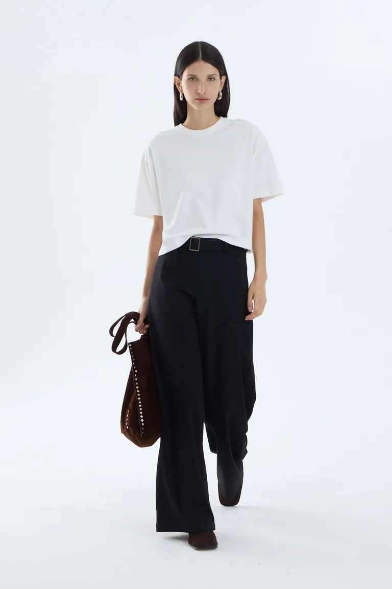 Pantalón de estilo moderno con silueta de pierna ancha y tiro alto. Presenta un diseño minimalista con ajuste en la cintura mediante cinturón incorporado, ideal para armar outfits urbanos y versátiles. Una prenda esencial que combina comodidad y elegancia contemporánea para el uso diario, permitiendo múltiples combinaciones en el guardarropa femenino.