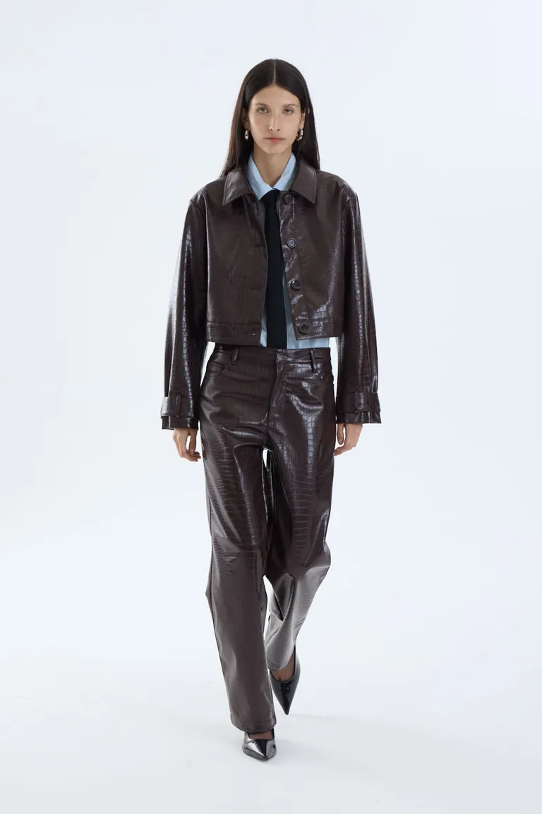 Pantalón de corte recto con textura de reptil. Diseño de tiro medio que aporta versatilidad y elegancia a tus equipos diarios. Una prenda clave para renovar tu vestidor con un estilo moderno y actual. Ideal para elevar cualquier propuesta de vestuario.