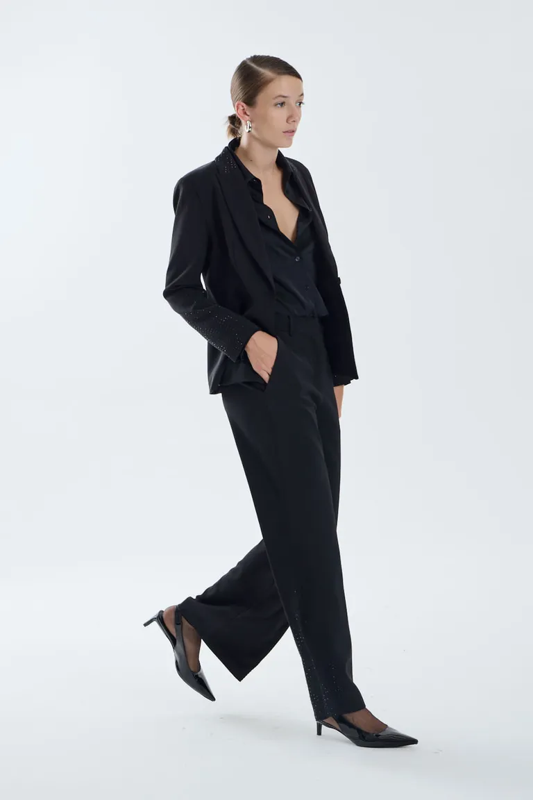 Pantalón de calce recto y tiro alto, diseñado con una silueta que brinda una caída fluida. Presenta detalles de tachas aplicadas en el ruedo que aportan un toque distintivo para ocasiones nocturnas. Una prenda versátil y cómoda, ideal para integrar en conjuntos formales o de noche con estilo.