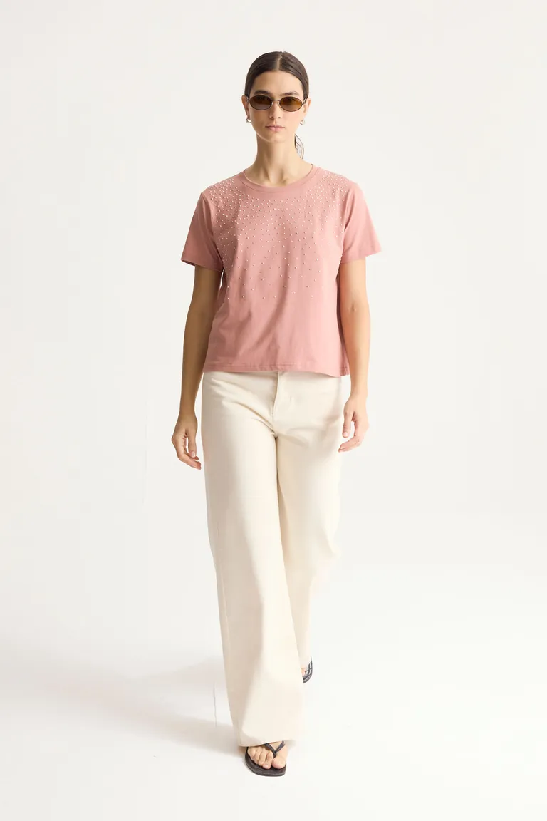 Remera de corte regular y mangas cortas con detalles de tachas metálicas en el delantero. Confeccionada en suave tejido de jersey de algodón, perfecta para looks casuales y urbanos.