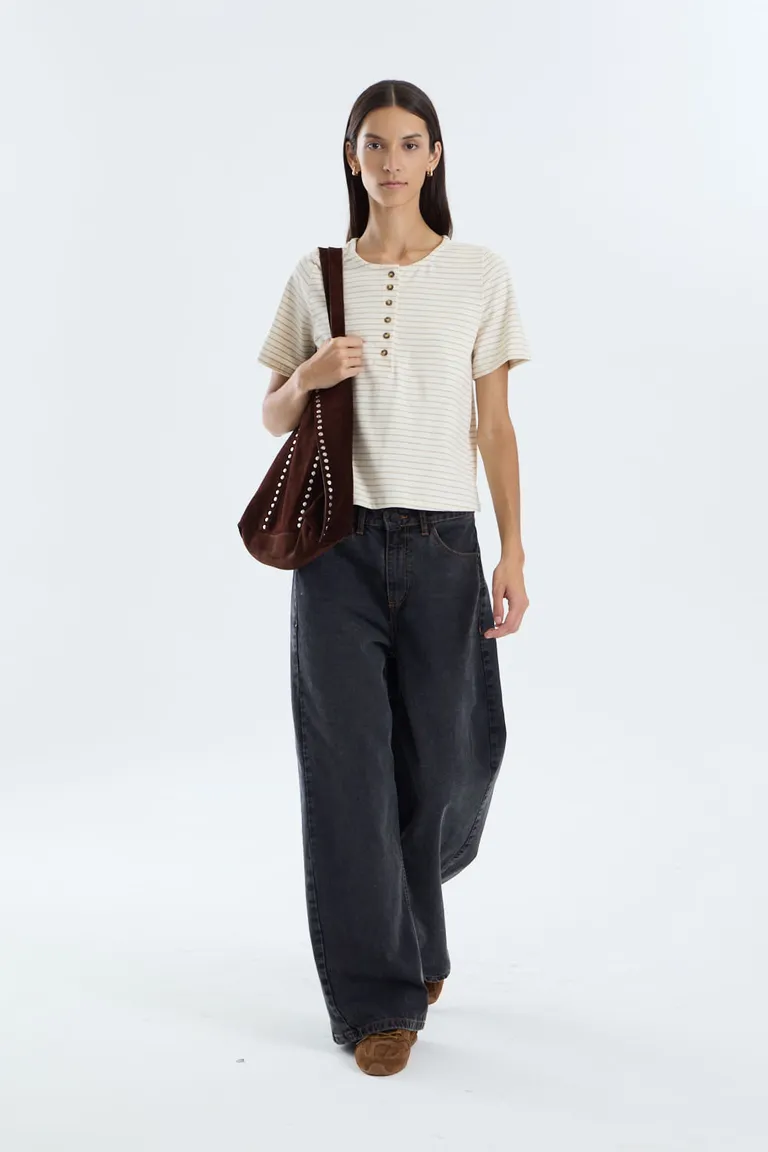 Remera de corte regular con mangas al codo y cuello redondo con detalle de cartera frontal con pequeños botones. Presenta un diseño de rayas finas y estilo casual, ideal para complementar diversos outfits diarios de manera versátil.