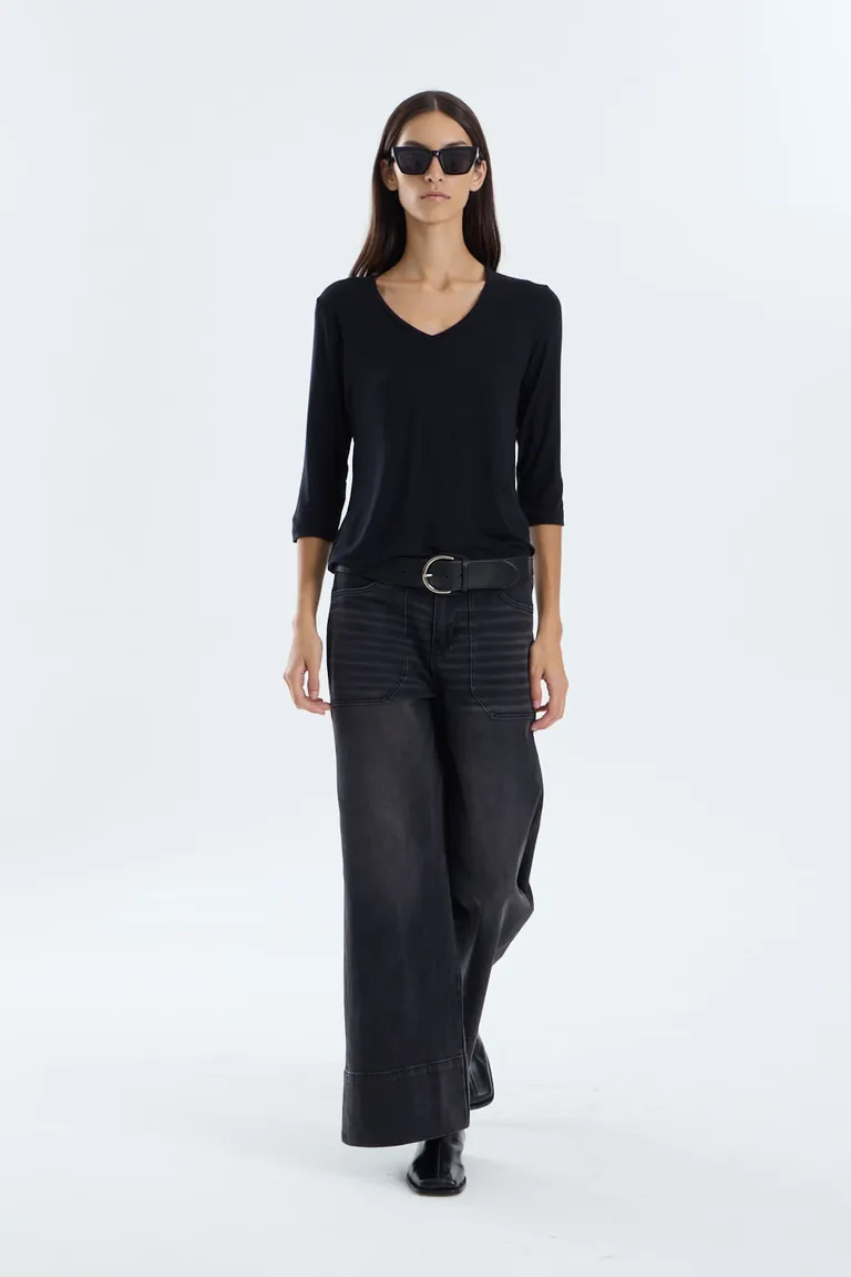 Remera de corte recto con diseño clásico y elegante, ideal para un look versátil. Cuenta con un escote en V favorecedor y mangas de largo tres cuartos, brindando comodidad y estilo. Esta prenda es un básico esencial para integrar en cualquier equipo diario, adaptándose con facilidad a diversas ocasiones y combinaciones de moda urbana.