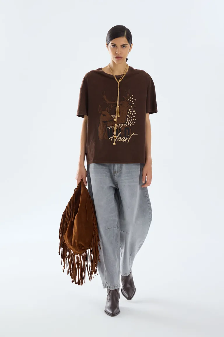 Remera de manga corta con escote redondo, diseñada con un calce holgado y relajado. Presenta un estampado gráfico frontal con temática de naturaleza que le aporta un estilo distintivo. Ideal para lograr un look urbano y cómodo en cualquier ocasión diaria.