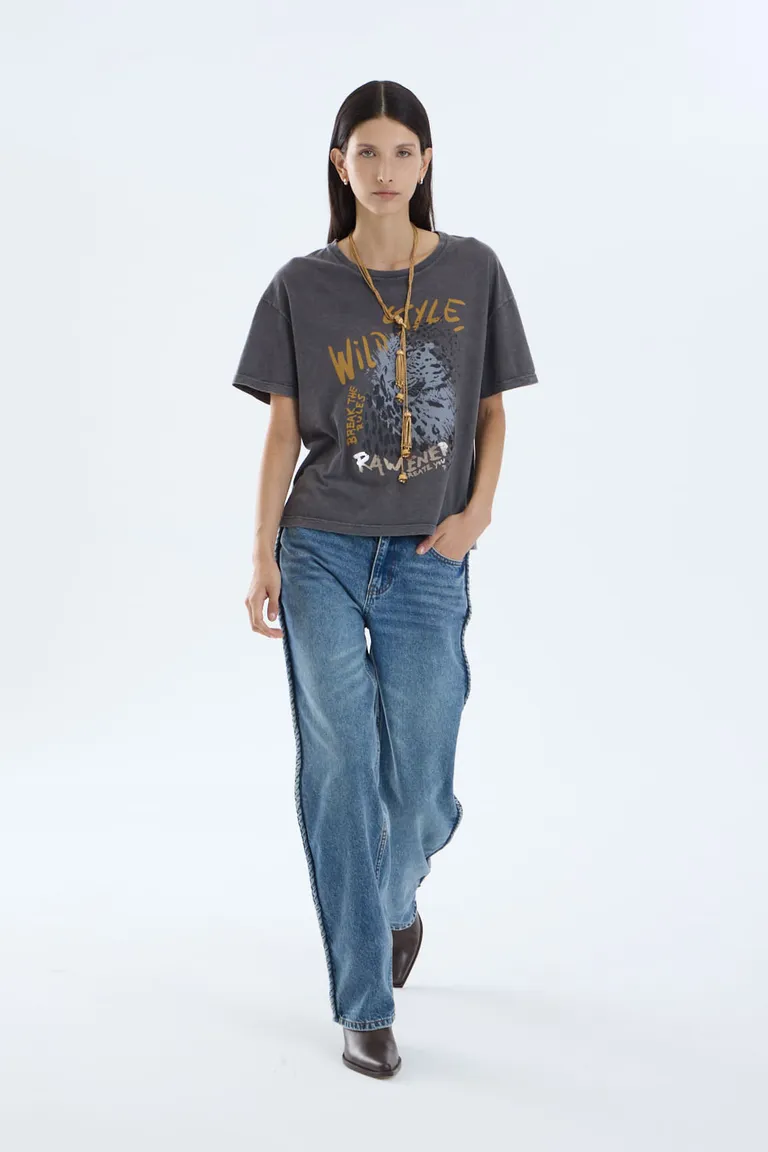 Remera de manga corta con cuello redondo a la base. Presenta un proceso de lavado en prenda y estampa central con detalles decorativos en el frente. Una prenda versátil y urbana para incorporar a tus looks diarios.