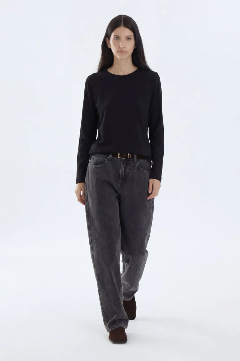 Remera de manga larga con cuello redondo y calce regular. Una prenda versátil ideal para crear diversos conjuntos urbanos, ofreciendo comodidad y un estilo atemporal para el uso diario en toda ocasión.