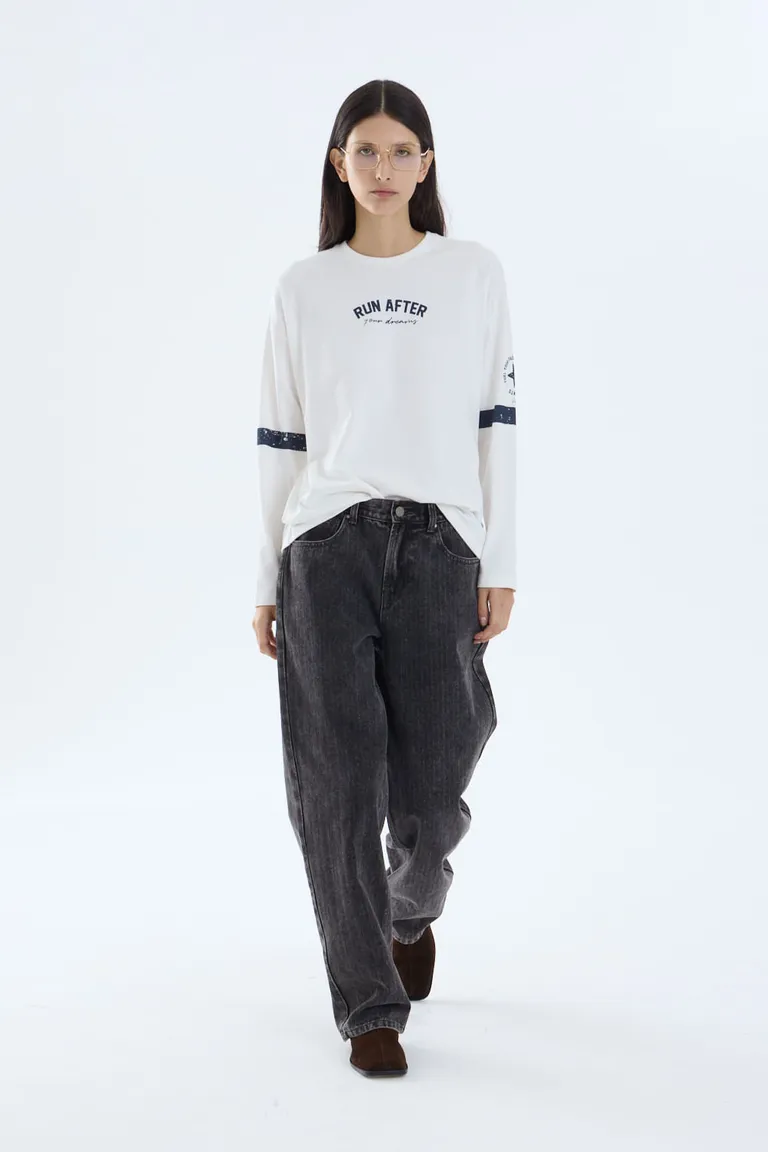 Remera de manga larga con escote redondo, diseñada con una silueta relajada y versátil. Presenta detalles de estampa frontal y en las mangas que le otorgan un estilo inspirado en la estética college, ideal para integrar en conjuntos casuales de uso diario en cualquier temporada.
