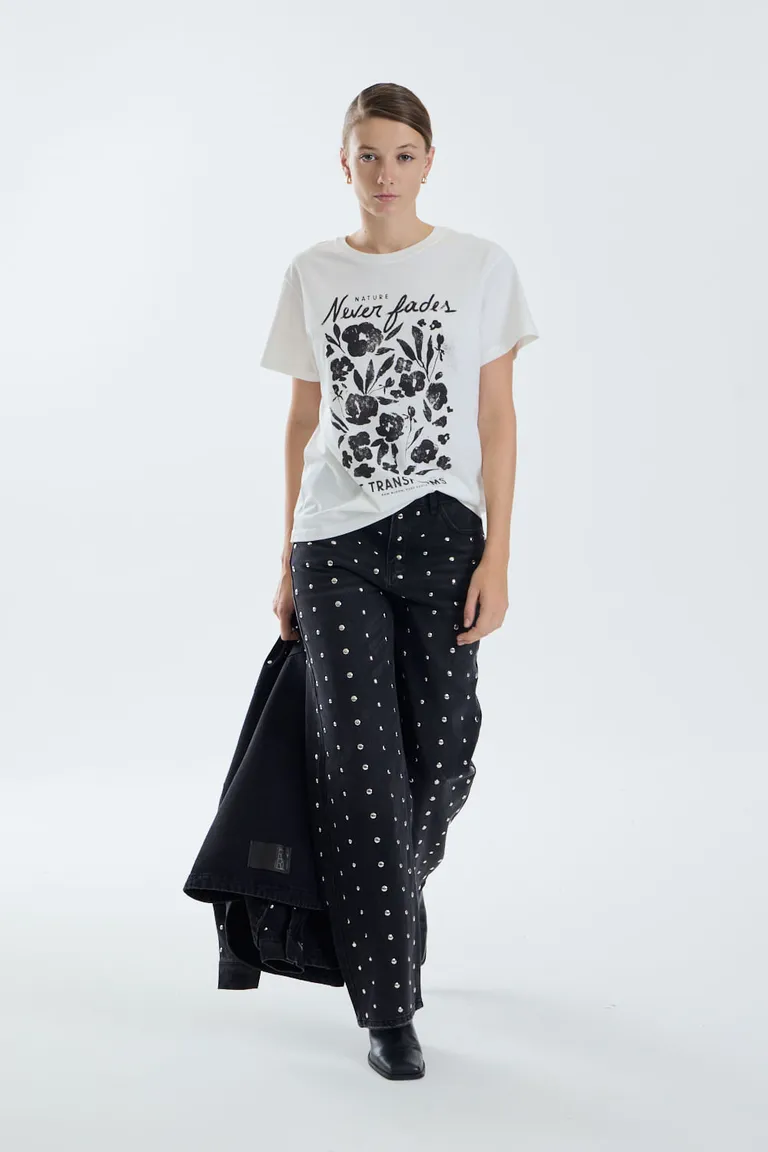 Remera de corte clásico con mangas cortas y escote redondo. Presenta un diseño versátil con estampa frontal que aporta un toque distintivo a cualquier conjunto casual. Ideal para un look diario cómodo y moderno.