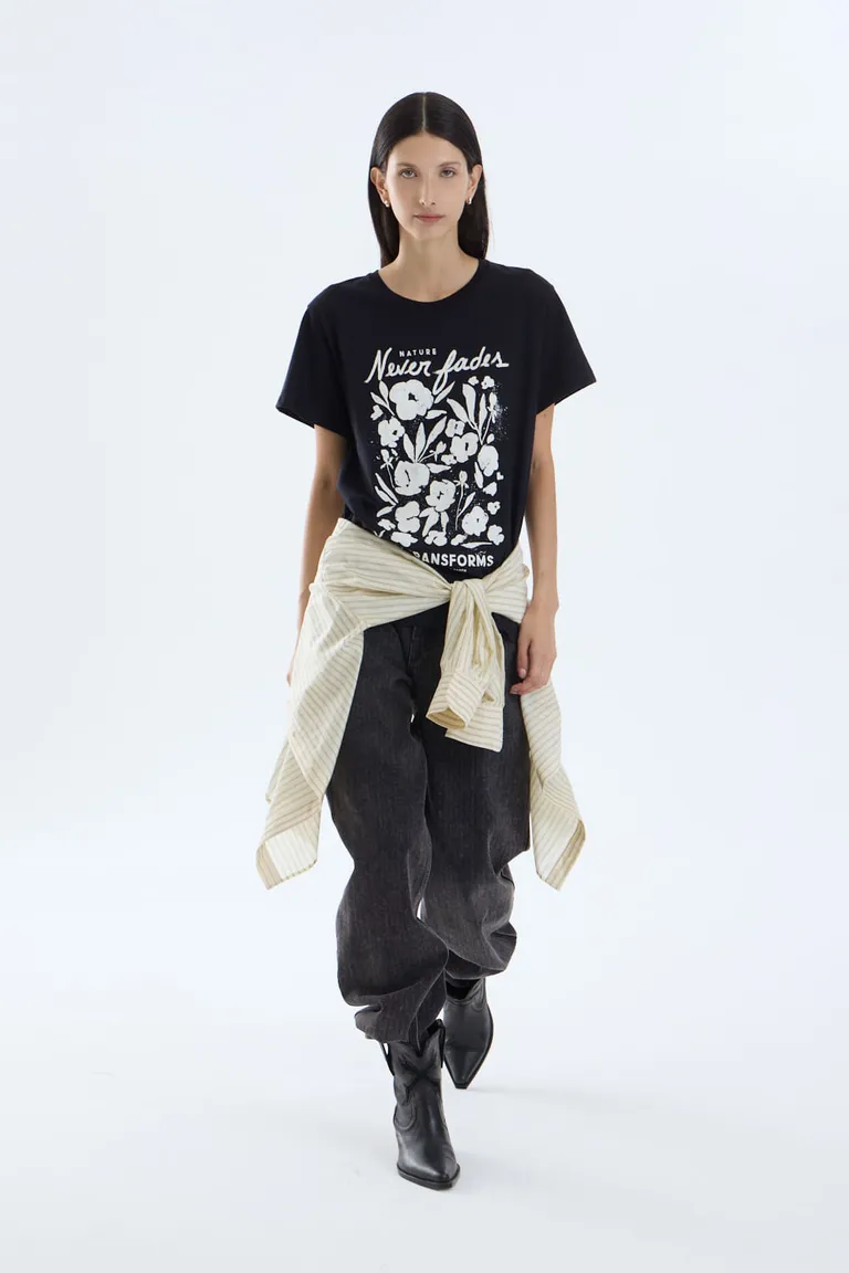 Remera de mangas cortas con escote redondo, diseñada con corte clásico y detalle de estampa gráfica en el frente. Ideal para combinar en outfits diarios, aportando comodidad y un estilo casual. Presenta cuello terminado en ribb, brindando una caída natural y adaptándose al cuerpo. Una prenda versátil para el uso cotidiano.