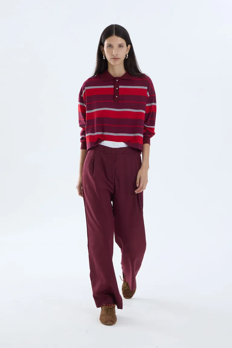 Remera de mujer con diseño de cuello polo y mangas largas con un patrón de rayas horizontales. Presenta una silueta cómoda y versátil, ideal para completar equipos informales con un toque clásico.