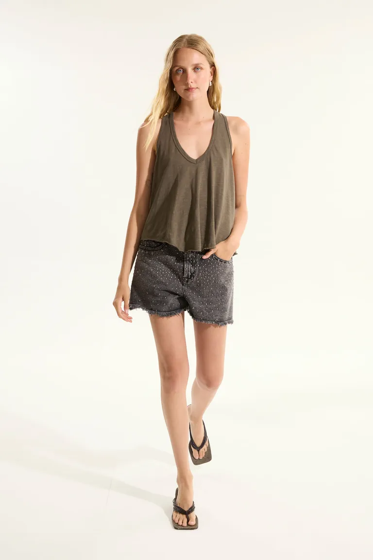 Remera musculosa de diseño evase con detalle en las terminaciones. Una prenda versátil y cómoda que se adapta a diferentes estilos. Ideal para combinar con pantalones, faldas o shorts.