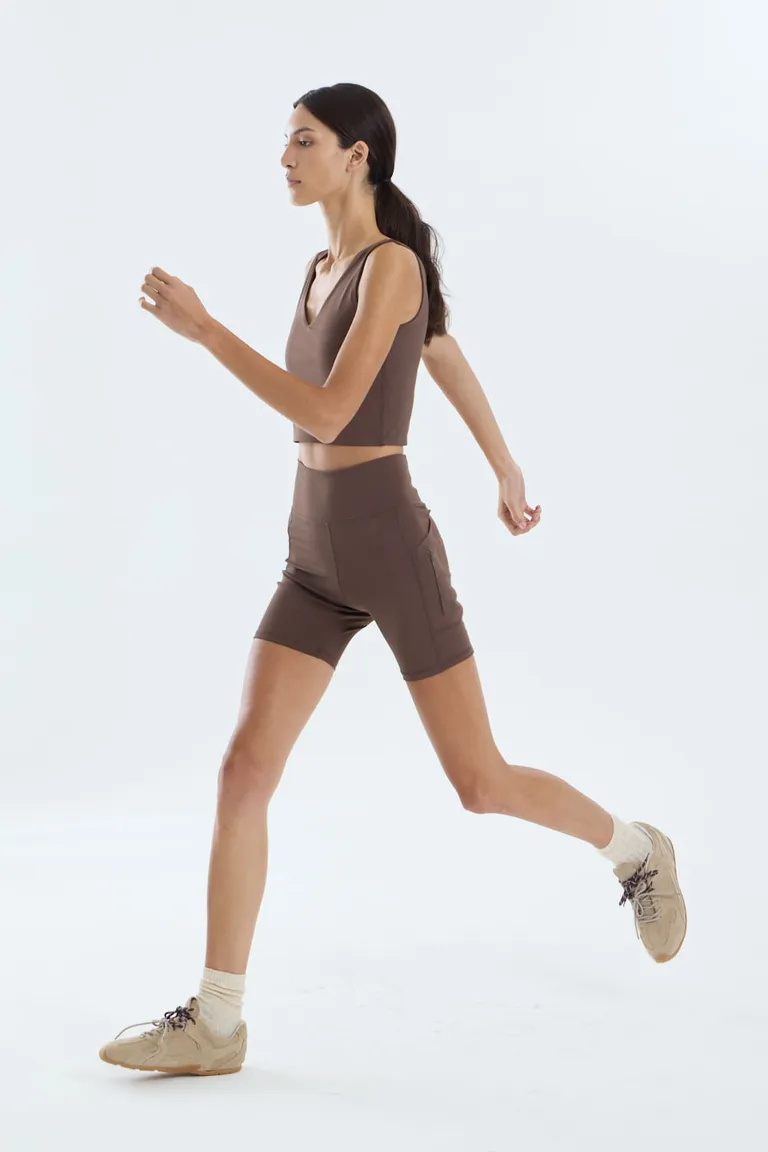 Short deportivo de tiro alto diseñado para brindar sujeción y libertad de movimiento. Presenta un ajuste anatómico con bolsillos laterales y en la parte posterior de la cintura, ideal para actividades físicas. Su diseño incorpora detalles funcionales en las costuras y terminaciones que favorecen la comodidad durante el entrenamiento.