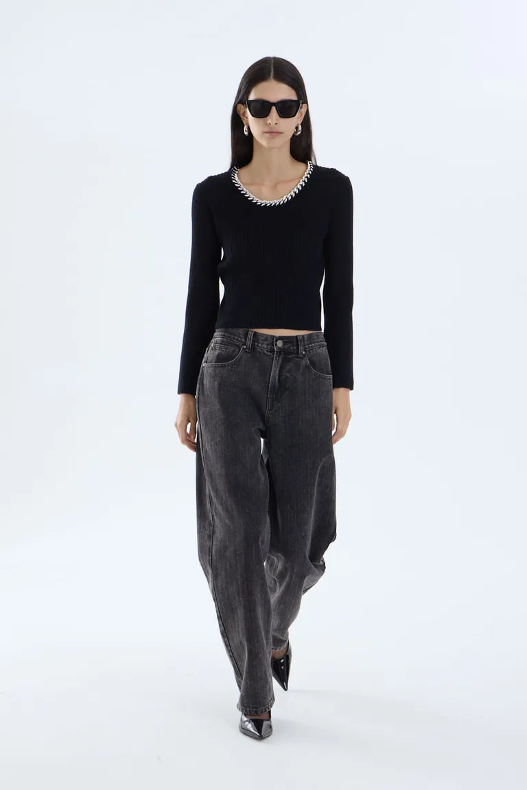 Sweater de manga larga con ajuste al cuerpo y detalle de cadena decorativa en el escote. Una prenda versátil y moderna, diseñada para completar looks urbanos con un toque sofisticado. Su diseño clásico permite diversas combinaciones para el uso diario o eventos casuales, brindando comodidad y estilo en cualquier momento.