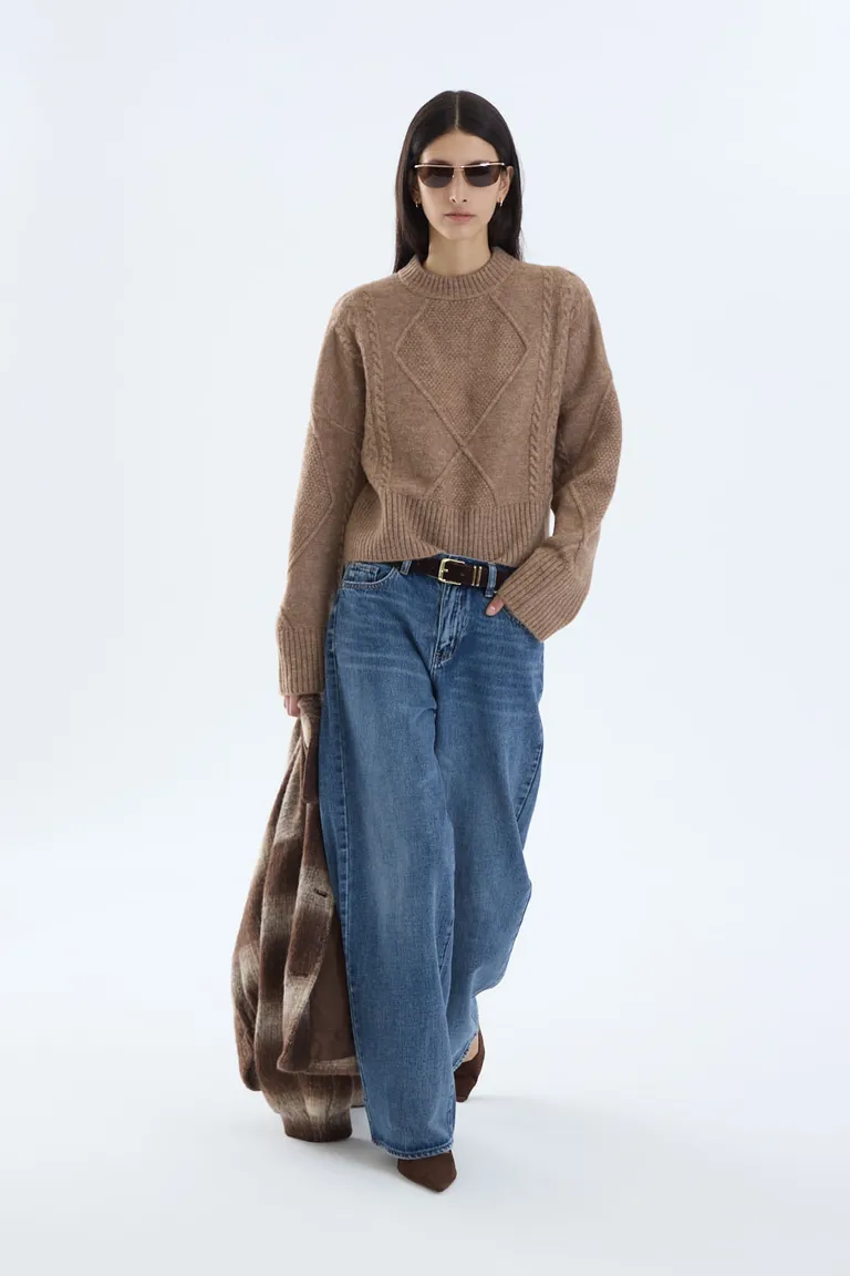 Sweater de calce relajado con diseño de trenzas y ochos en relieve. Presenta cuello alto y mangas amplias, ofreciendo una opción versátil y moderna para el uso cotidiano. Su estilo estructurado permite crear diversos conjuntos urbanos con facilidad.