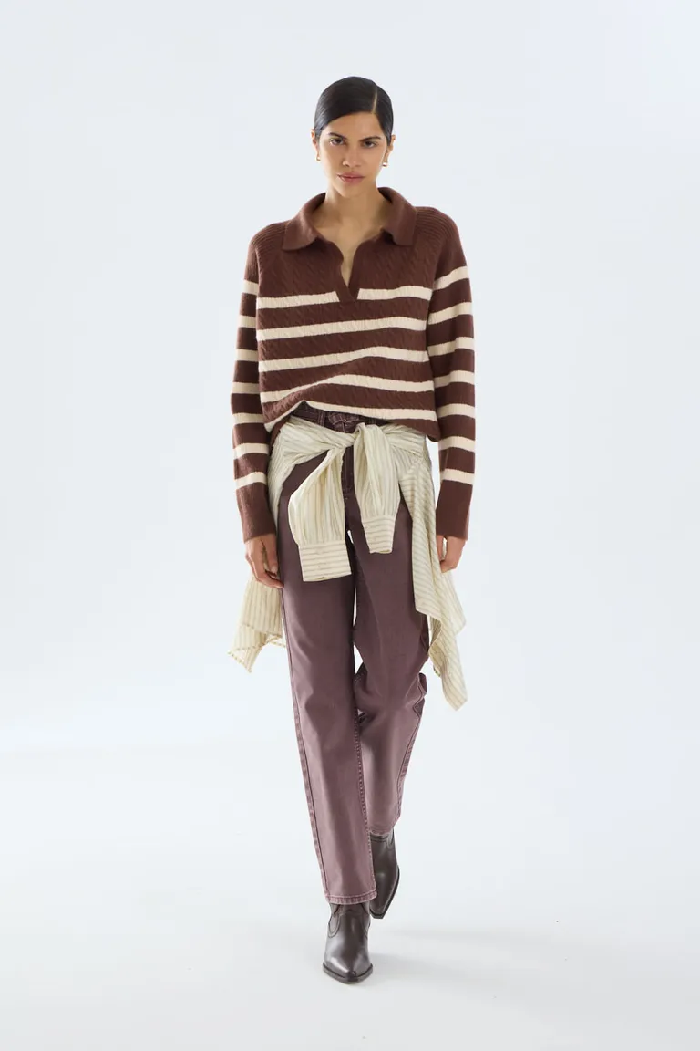 Sweater tejido con diseño a rayas horizontales, cuello polo y calce relajado. Una prenda versátil y cómoda, ideal para integrar en conjuntos casuales de media estación. Su diseño clásico de mangas largas ofrece un estilo atemporal y funcional para el uso diario en diversas ocasiones.