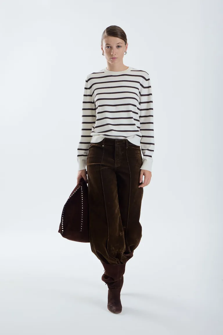 Sweater de diseño clásico con escote redondo y mangas largas. Posee un calce cómodo y versátil, ideal para completar diversos conjuntos de temporada. Con un largo que llega a la altura de la primera cadera, ofrece un estilo atemporal y funcional para el uso diario. Esta prenda destaca por su tejido de acabado suave y su patrón de rayas horizontales, adaptándose perfectamente a diferentes ocasiones y preferencias de vestimenta.