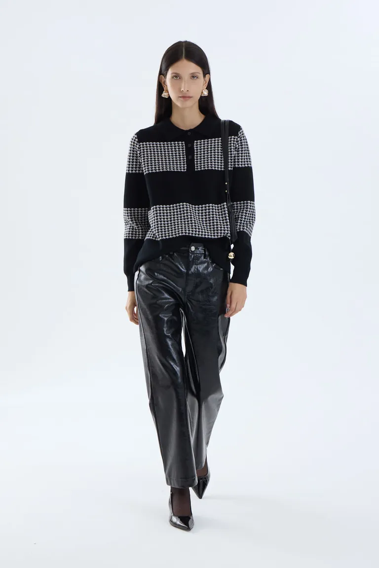 Sweater tejido de calce relajado con diseño de rayas y detalle de botones en el cuello. Una prenda versátil y cómoda ideal para completar looks urbanos de temporada con un estilo clásico y distinguido.