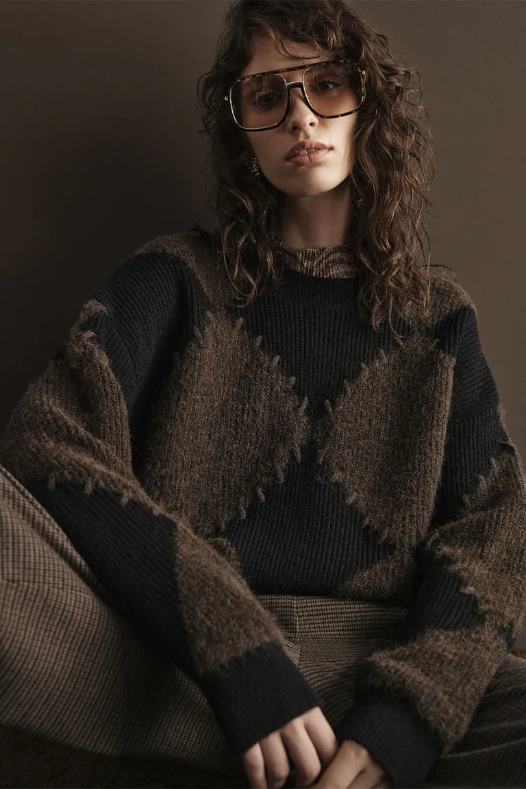 Sweater tejido con diseño de rombos y detalles en relieve. Presenta un corte holgado, cuello redondo y terminaciones acanaladas en puños y cintura, brindando una opción cómoda y versátil para el uso diario en climas fríos.