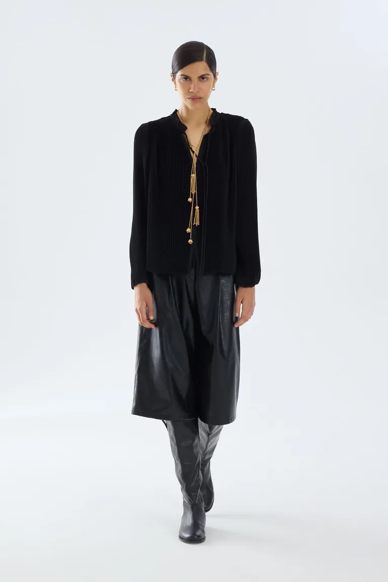 Top de calce amplio con mangas largas estilo balloon. Presenta un escote ligeramente en v con un delicado lazo en el cuello. Una prenda versátil ideal para integrar en looks cotidianos o eventos especiales, destacándose por su caída y textura sutil.