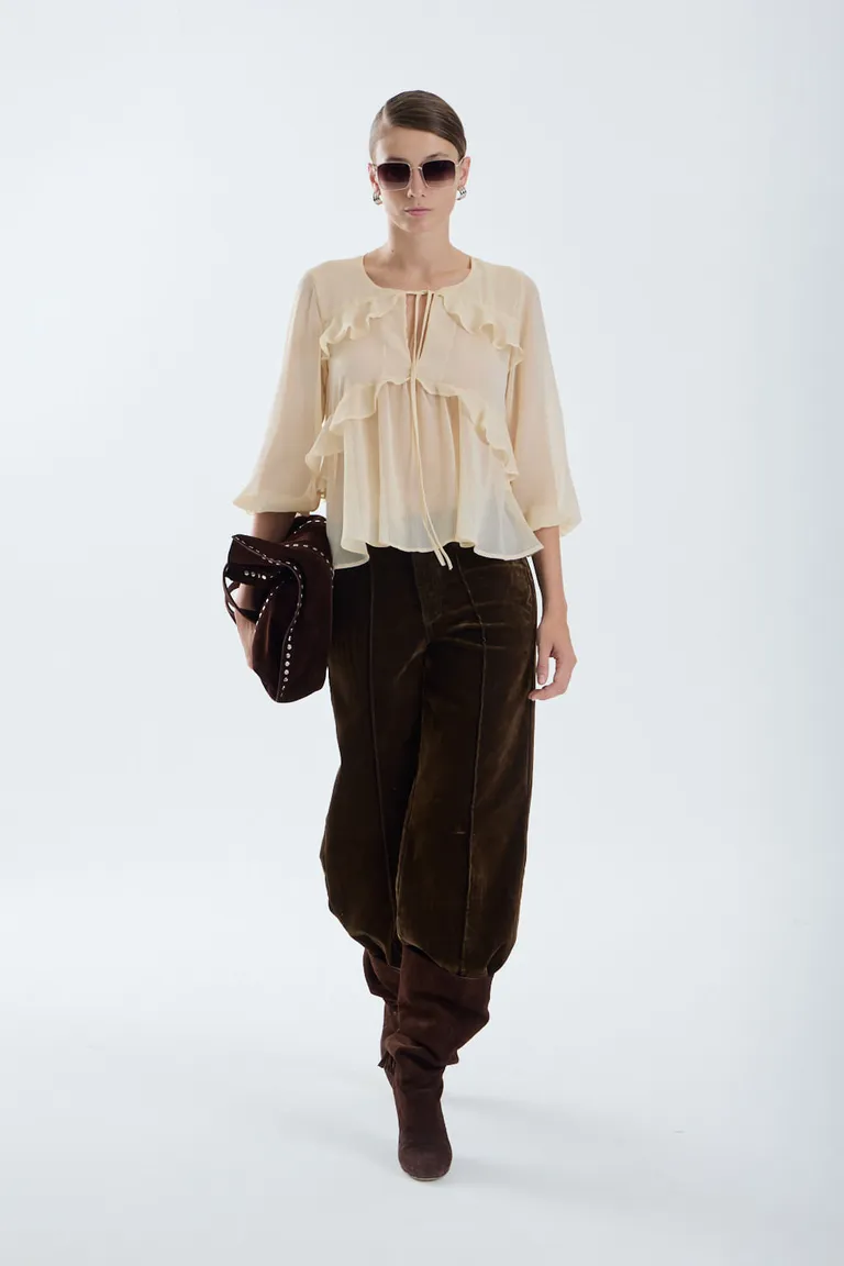 Top de calce holgado y ligero con volados en el frente. Presenta un escote redondo abierto con un lazo fino para anudar y mangas con volumen rematadas en puños elastizados. Una prenda versátil y delicada para sumar elegancia a tus conjuntos diarios.