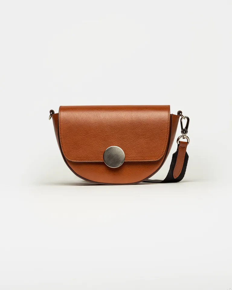 Bandolera de diseño circular con solapa y cierre de herraje metálico central. Este modelo cuenta con una correa ajustable y desmontable, ideal para complementar distintos outfits. Su estilo versátil permite el uso diario o para eventos sociales, brindando comodidad y funcionalidad. Un accesorio esencial que combina elegancia y practicidad para organizar tus objetos personales.